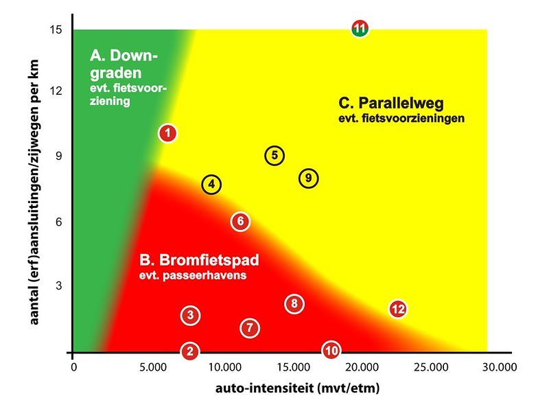 De nadelen van downgraden zijn grotendeels inherent aan de gekozen oplossing. Een ETW is alleen veilig als er ook voldoende maatregelen genomen worden om het attentieniveau te verhogen en de snelheid en de intensiteit van het autoverkeer te beperken. Daarnaast vermindert de doorstroming van het autoverkeer en openbaar vervoer. Bij ETW type I res-teert een aantal conflicten op het fietspad, maar deze zijn minder ernstig dan bij een fiets/bromfietspad langs een GOW, omdat bromfietsers geen gebruik mogen maken van het fietspad.