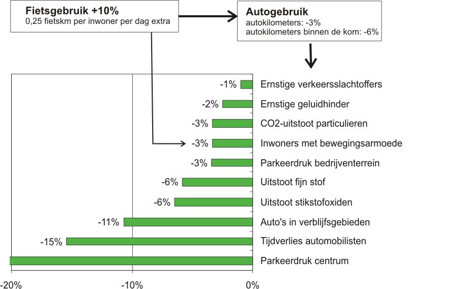 Onderstaande grafiek geeft een overzicht van de belangrijkste resultaten. Het aantal autokilometers in en om Alkmaar daalt met 3 procent. Binnen de bebouwde kom is deze daling zelfs twee keer zo groot (-6%). Deze verschuiving van auto naar fiets heeft substantiële tot zeer grote effecten voor negen van de tien onderzochte problemen. Alleen de reductie van het aantal ernstige verkeersslachtoffers is bijna nihil.