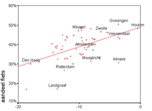 Bij deze optimistische conclusie passen twee kanttekeningen. Ten eerste geeft de computer helaas niet aan wat oorzaak is en wat het gevolg. Het is mogelijk dat goede fietsvoorzieningen inderdaad leiden tot meer fietsgebruik. Maar andersom kan ook: het hoge fietsgebruik heeft een andere oorzaak en gemeenten met veel fietsers besteden gewoon meer aandacht besteden aan hun fietsvoorzieningen. De tweede kanttekening is, dat ‘slechts' 20 procent van de verschillen tussen gemeenten verklaard wordt door de fbscore. (als alle punten op 1 lijn liggen is 100 % verklaard). Reden om op zoek te gaan naar andere oorzaken voor verschillen in het fietsgebruik tussen gemeenten.