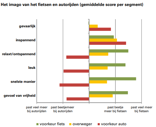 De drie invalshoeken leveren deels verschillende antwoorden op. De imago-aspecten hangen sterk samen met het fiets en dat sluit aan bij een belangrijke conclusie uit de discussiegroepen. Mensen hebben vaak een individuele basisvoorkeur. De één vindt het relaxed en leuk om met de auto de stad in te gaan, ondanks de files en het zoeken naar een schaarse parkeerplaats. De ander raakt alleen al bij de gedachte gestrest en krijgt juist op de fiets een gevoel van vrijheid.